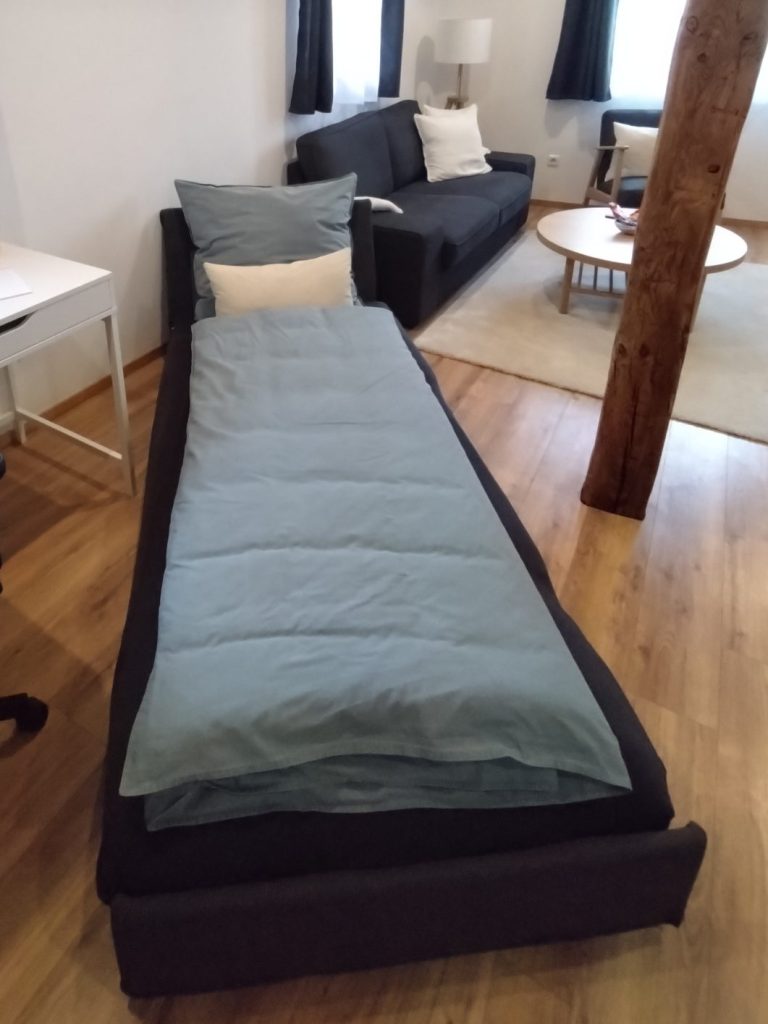 - die Einsitzer-Couch ist ebenfalls zum Bett (mit Lattenrost) ausklappbar